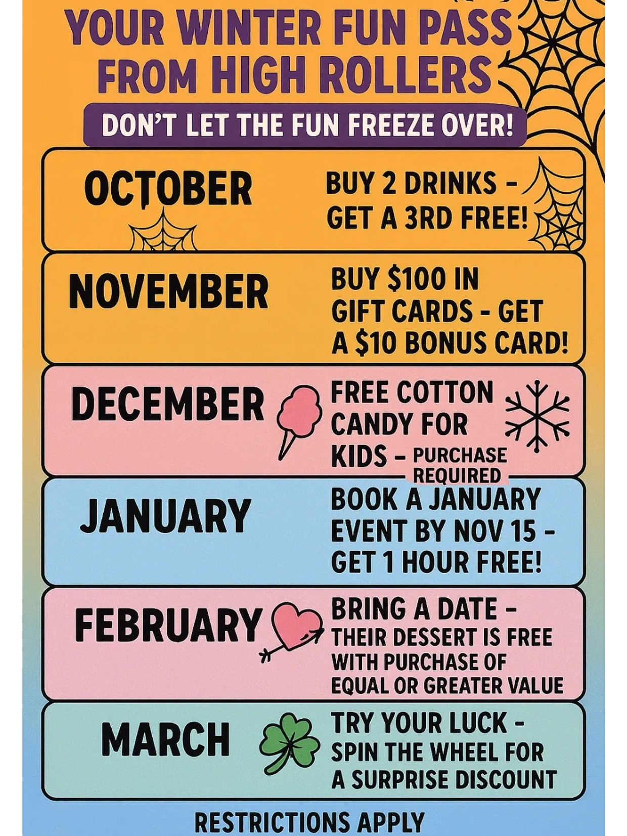 Looking for something new to do? Come hang out with friends and family at High Rollers Company — where there’s always something happening! Enjoy good food, great treats, adult beverages for Mom and Dad, pool tables, board games, and karaoke in a fun, relaxed atmosphere.
